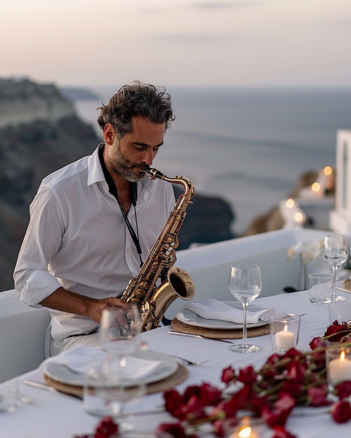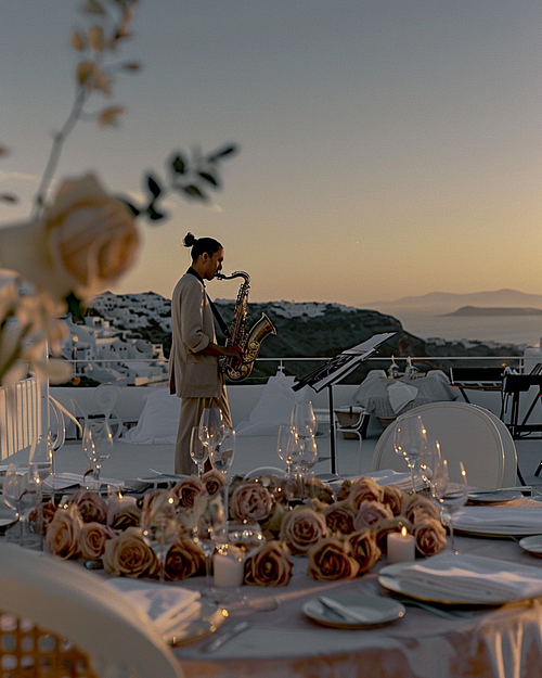 A beautifully styled table, candles, florals, and music — curated for your taste and your budget. Perfect for engagements, anniversaries, birthdays, and unforgettable evenings in Santorini.