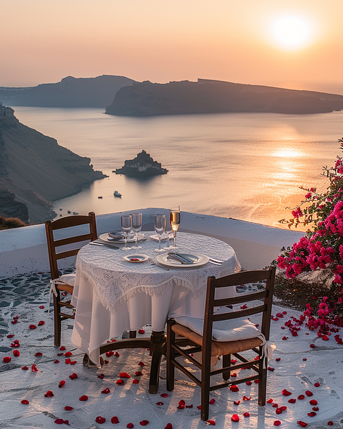 A private luxury heart setup designed for proposals, weddings, romantic dinners and special celebrations with breathtaking caldera views.